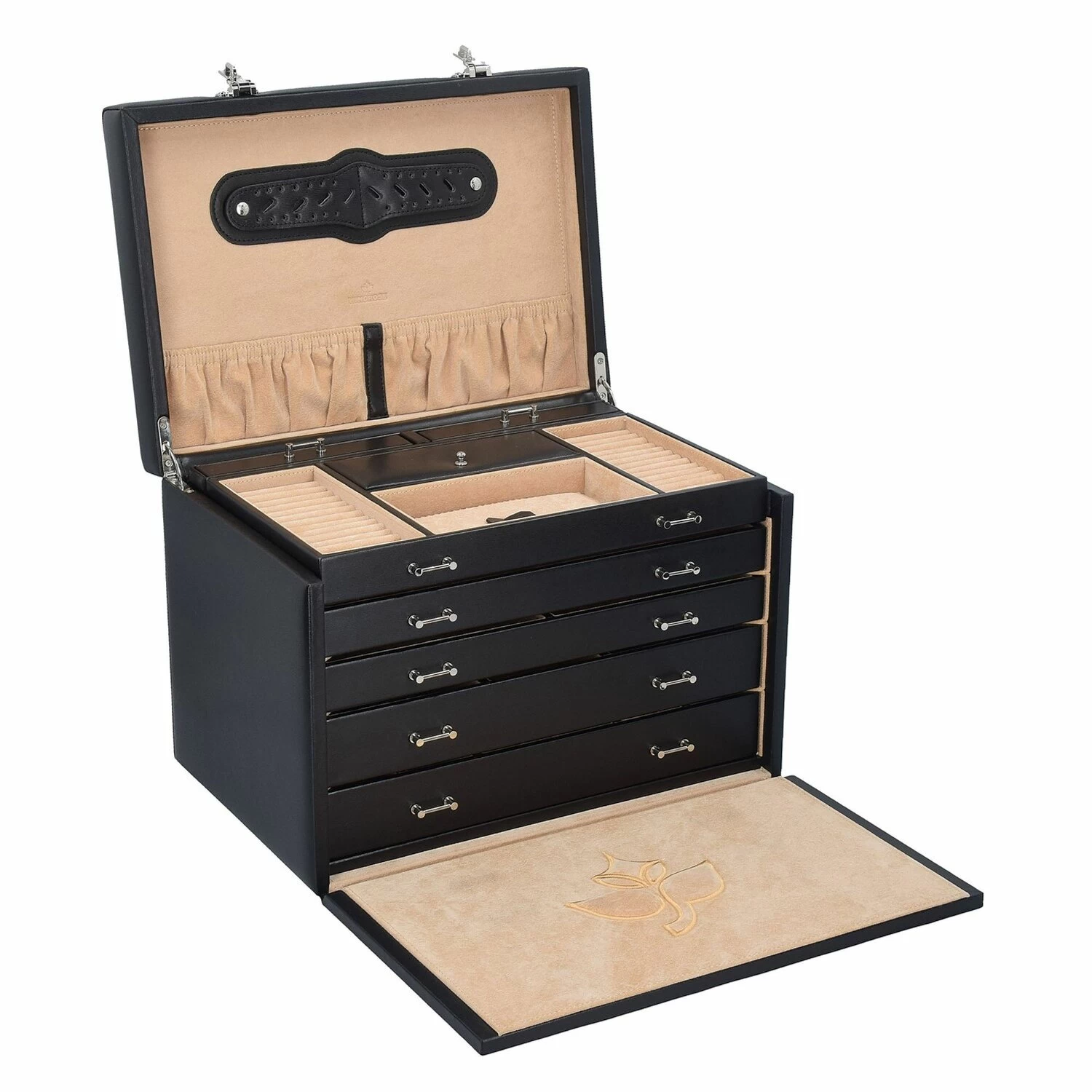 – étage supérieur : 2 baguettes offrent beaucoup de place pour les bagues, 1 grand compartiment avec couvercle, ainsi que 2 compartiments extractibles avec œillets pour les chaînes et les bracelets